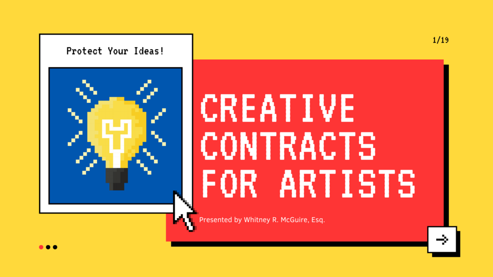 Do you know how to protect your intellectual property? As an artist, it’s important you know how to protect your practice. Contracts are a fact of life in any business so it’s important you empower yourself to sign good contractual agreements. A contract review requires diligence and an eye for detail. Designed and led by me, Whitney McGuire, this legal series will help you walk away more confidently about those tricky terms and conditions and fine print. I will provide an overview of essential legal terms such as copyrights, patents, and trademarks; I will also discuss how to protect and price your work, address common clauses, and find sustainability in your practice.